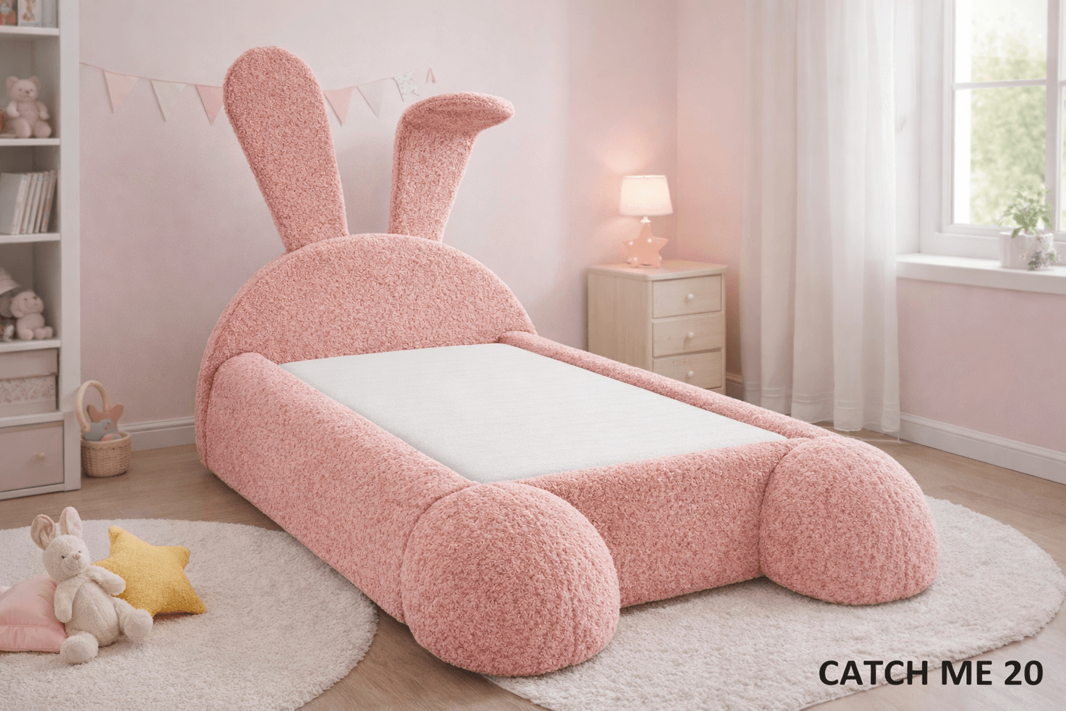 Duże, charakterystyczne uszy królika, miękkie zaokrąglone kształty i przyjemna w dotyku tapicerka sprawiają, że łóżko jest nie tylko miejscem do spania, ale także elementem, który buduje cały klimat pokoju dziecięcego. Dzieci je uwielbiają, a rodzice doceniają jego funkcjonalność.