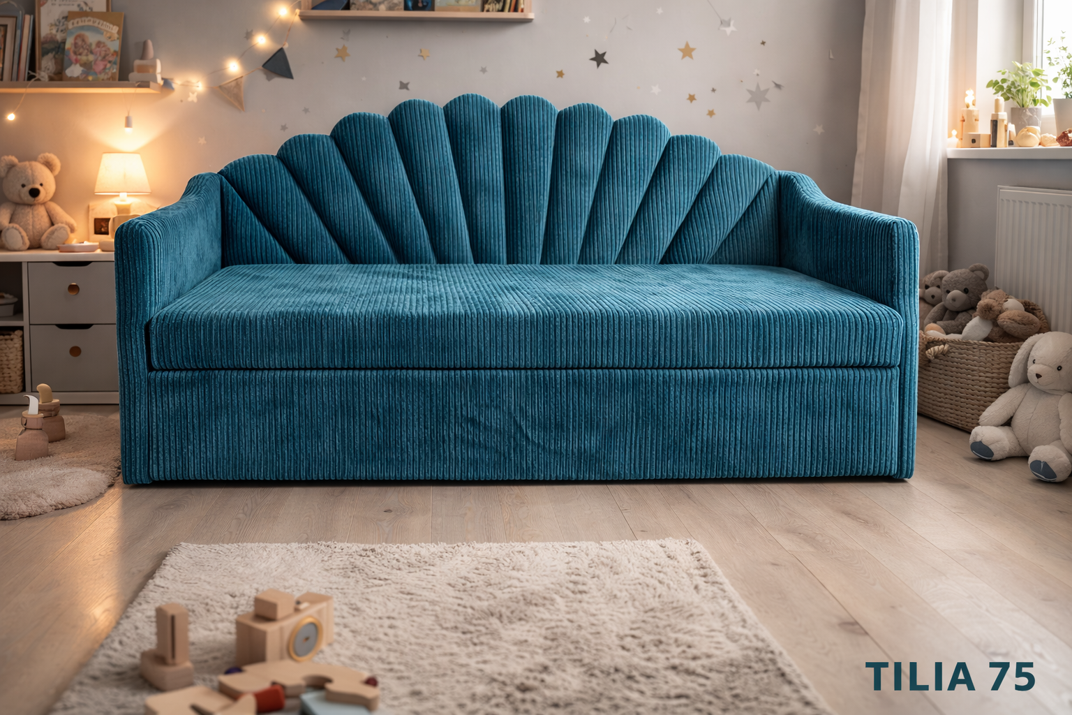 Model ze zdjęcia został wykonany w tkaninie TILIA – to materiał miękki, przyjemny w dotyku, a jednocześnie wytrzymały. Dobrze znosi codzienne użytkowanie, zabawy, wskakiwanie na łóżko i wszystko to, co dzieci potrafią wymyślić. Do wyboru masz jednak różne kolory i wykończenia, więc bez trudu dopasujesz łóżko do stylu wnętrza – od jasnych, pastelowych pokoi po bardziej nowoczesne aranżacje.